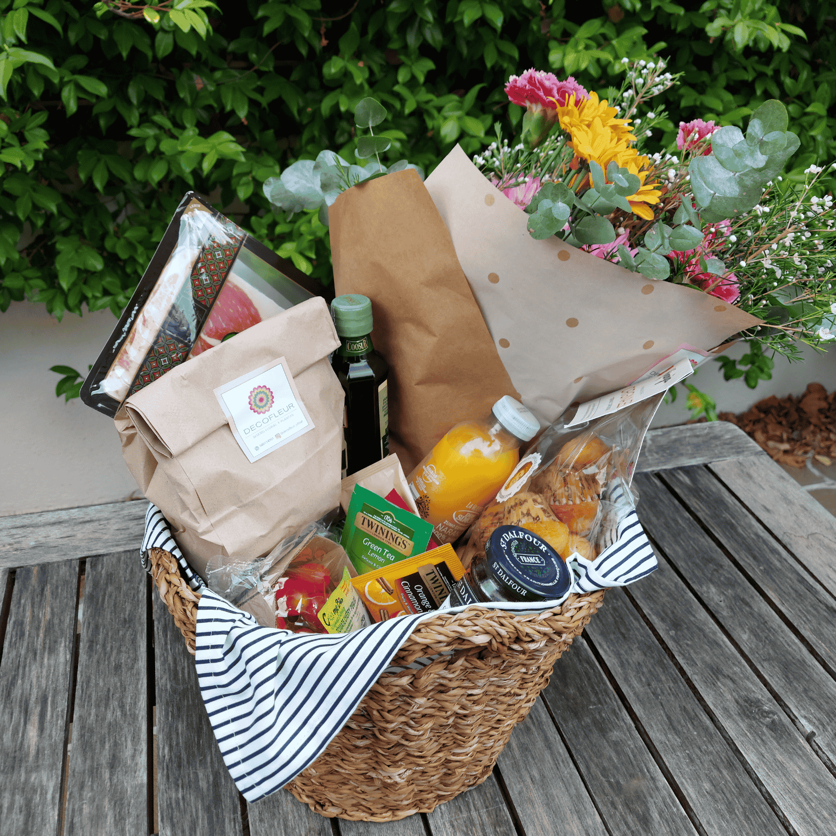 Cesta desayuno o picnic, con flores frescas de temporada y deliciosos productos para sorprender a esa persona que tanto se lo merece.